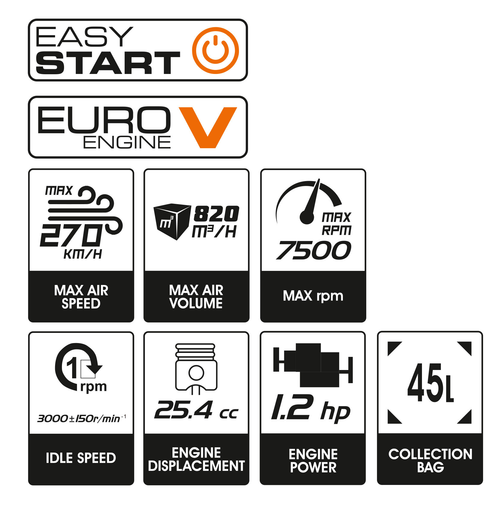 Motorni puhač, usisavač i drobilica namijenjen je učinkovitom čišćenju dvorišta, okućnica i vrtnih površina tijekom cijele sezone. Snažan benzinski motor s EURO V normom osigurava pouzdan rad i visoke performanse, dok funkcija puhanja omogućuje brzo uklanjanje lišća i nečistoća, a usisavanje s ugrađenom drobilicom znatno smanjuje volumen prikupljenog materijala. Velika brzina i protok zraka omogućuju učinkovit rad i na većim površinama, dok prostrana vreća za sakupljanje smanjuje potrebu za čestim pražnjenjem. Easy Start sustav olakšava pokretanje, a svestranost tri funkcije u jednom uređaju čini ga praktičnim rješenjem za održavanje urednog okoliša.
