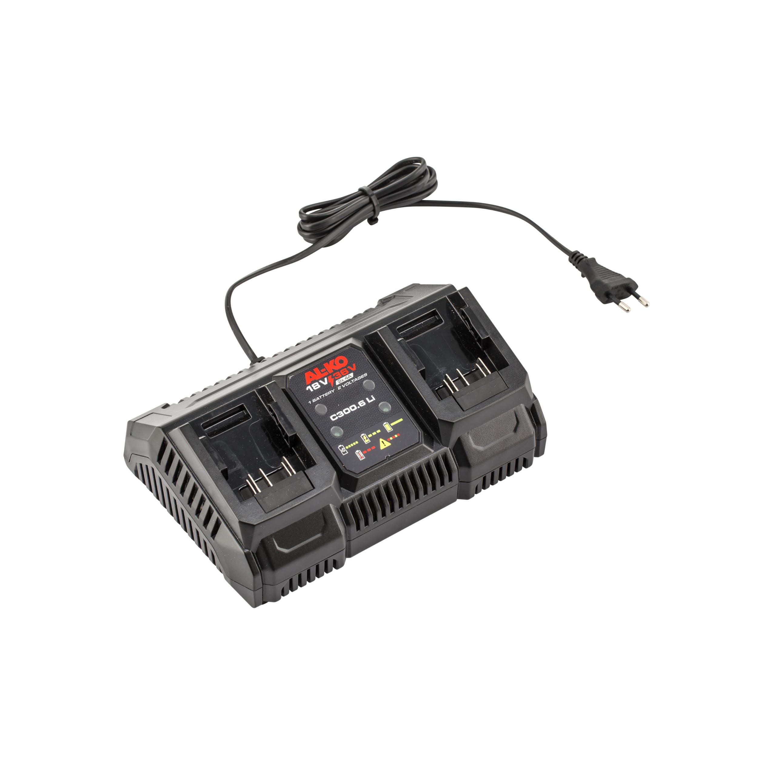 AL-KO C300.6 Li dvostruki punjač omogućuje brzo i praktično punjenje akumulatora iz sustava „1 Battery – 2 Voltages“, koji podržava rad na 18 V i 36 V uređajima. Zahvaljujući dvostrukom utoru moguće je istovremeno puniti dva akumulatora, čime se značajno skraćuje vrijeme pripreme alata za rad i povećava učinkovitost pri vrtlarenju ili održavanju okućnice. Punjač koristi struju punjenja 2 × 4 A, što osigurava brzo punjenje različitih kapaciteta baterija. LED indikator jasno prikazuje status punjenja – treptanje signalizira približno 85 % napunjenosti, dok stalno svjetlo označava potpuno napunjen akumulator. Klizna vodilica omogućuje jednostavno i sigurno umetanje baterija, a kompaktan dizajn i mala težina olakšavaju transport i korištenje u radionici ili vrtnoj kućici. Ovaj punjač kompatibilan je sa svim AL-KO akumulatorima iz serije 18 V i 18 V / 36 V „1 Battery – 2 Voltages“, čineći ga praktičnim rješenjem za korisnike više uređaja iz iste baterijske platforme.