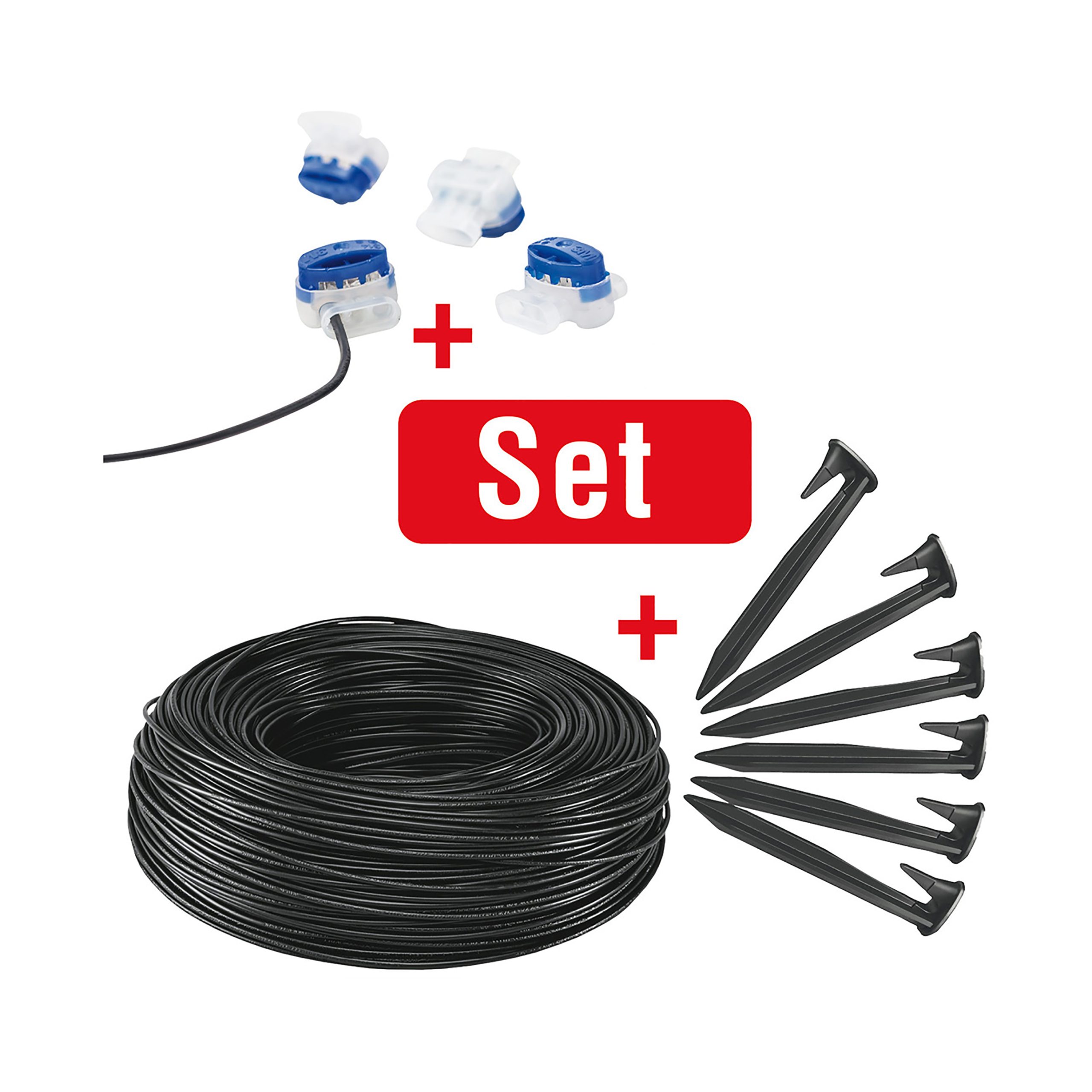 Instalacijski set AL-KO Verlegeset namijenjen je za postavljanje robotskih kosilica iz serije Robolinho®. Ovaj komplet sadrži sve osnovne komponente potrebne za instalaciju granične žice koja definira radno područje robotske kosilice. Zahvaljujući 150 m granične žice, kosilica može precizno prepoznati granice travnjaka, dok 90 klinova za tlo omogućuje jednostavno i sigurno učvršćivanje kabela na površini travnjaka. Uključeni kabelski konektori omogućuju brzo i pouzdano spajanje ili produžavanje granične žice. Set je idealan za prvu instalaciju robotske kosilice ili proširenje postojećeg radnog područja.