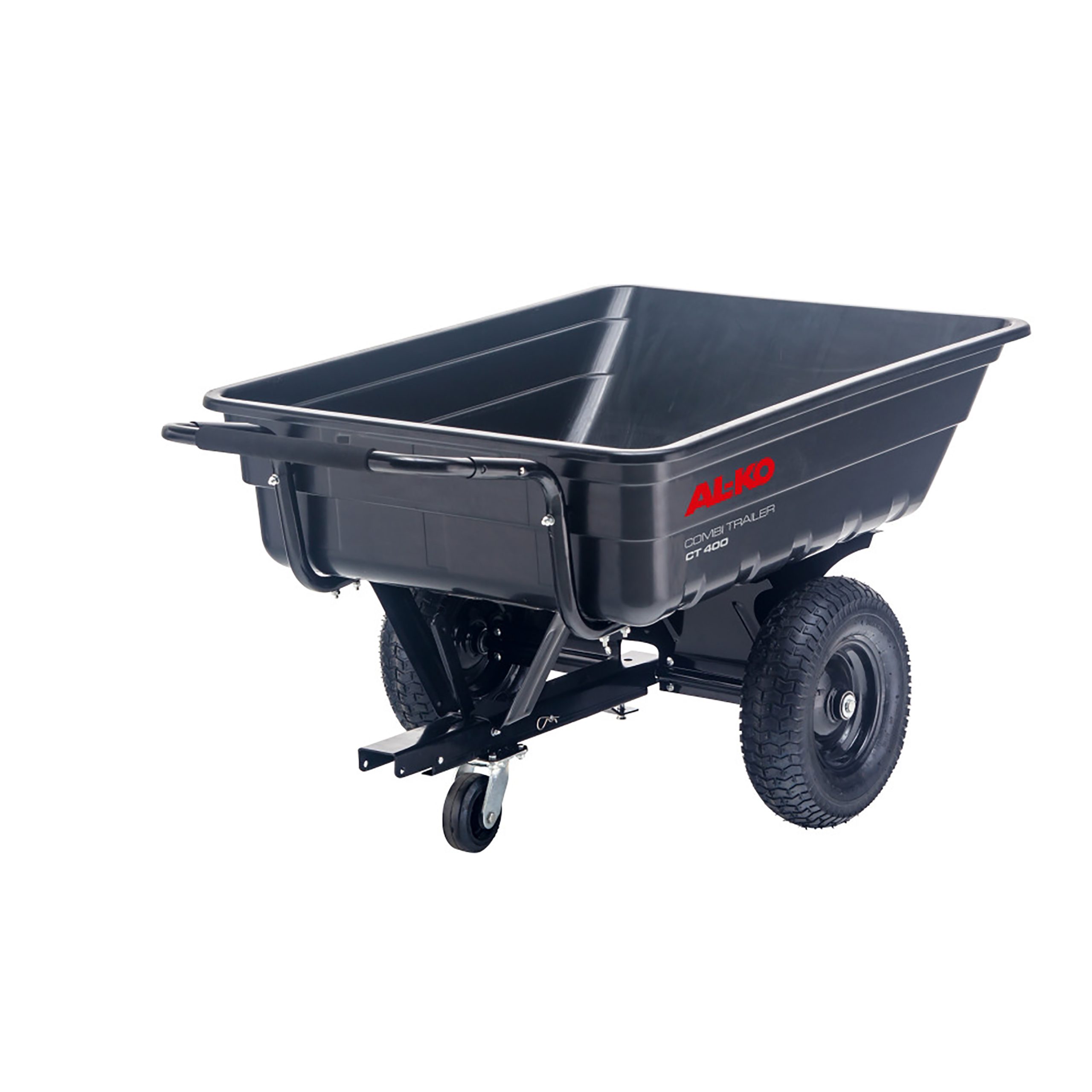 Kombinirana prikolica AL-KO CT 400 stabilan je i svestran dodatak za rad s traktorskim kosilicama. Namijenjena je transportu trave, lišća, gnojiva, pijeska, malča, drva i drugih materijala u vrtu ili na imanju. Zahvaljujući nagibnoj konstrukciji i velikoj, čvrstoj ručki, istovar je brz i jednostavan, a prikolica se po potrebi može koristiti i kao samostalno prijevozno sredstvo. Maksimalna nosivost iznosi 400 kg na ravnoj podlozi te 200 kg na uzbrdici ili nizbrdici, uz preporučenu maksimalnu brzinu od 5 km/h. Snažne profilirane gume dimenzija 16×6.5-8 osiguravaju stabilnost i pouzdano prianjanje na različitim terenima. Model CT 400 koristi se isključivo uz odgovarajuću kuku za priključak. Za modele Easy, Black Edition i Comfort potrebna je kuka br. art. 119831. Za Premium seriju koristi se kuka br. art. 119608.