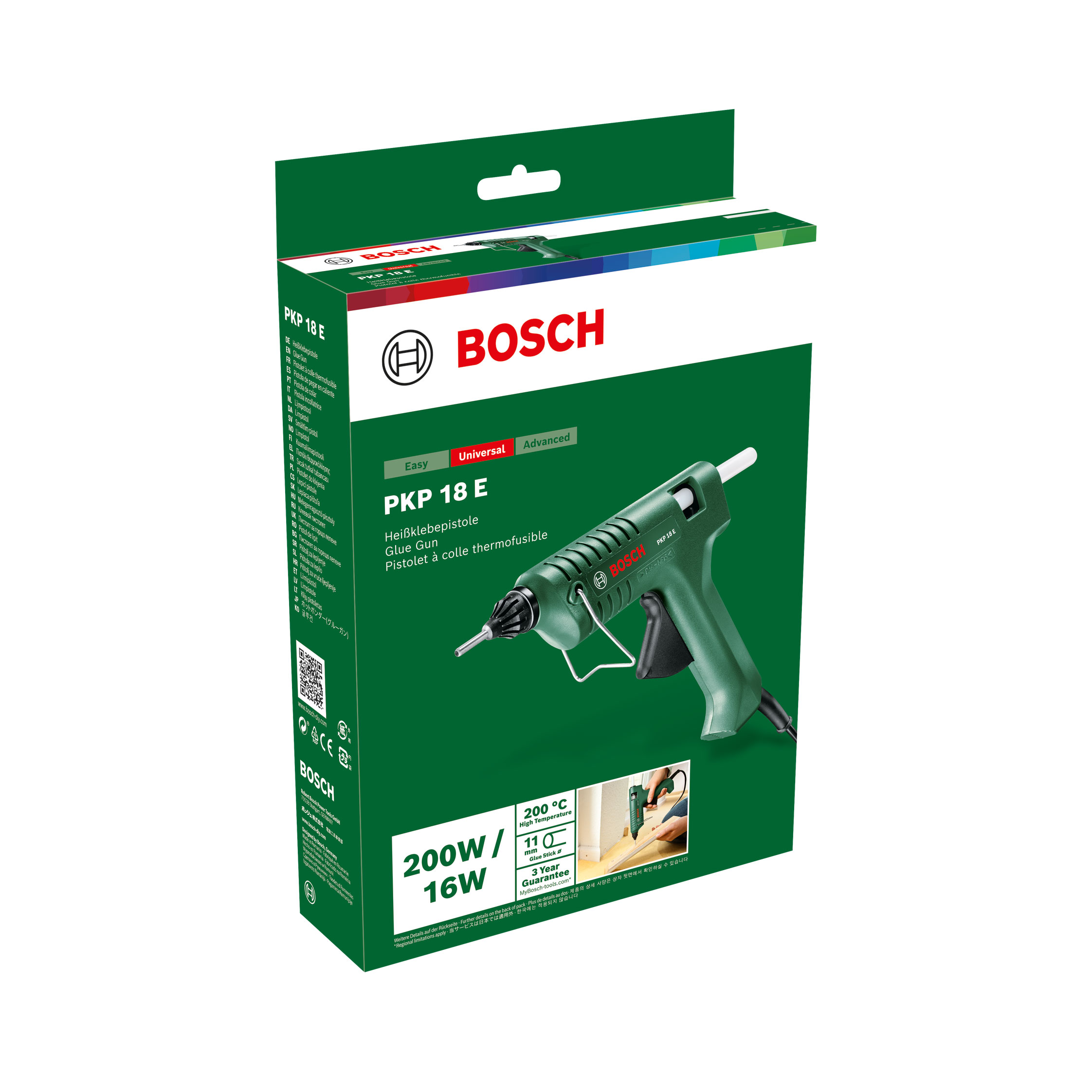 Robusni pištolj za vruće lijepljenje PKP 18 E jamči čist rad i čvrste lijepljene spojeve. Elektronski regulirani grijaći element osigurava konstantnu radnu temperaturu od 200 stupnjeva Celzijusa i brzo zagrijavanje, a time i radnu pripravnost. Zahvaljujući mehaničkom pomaku moguće je točno doziranje kao i usmjereno, brzo nanošenje ljepila. Integrirani zaustavljač smanjuje kapanje ljepila, a s naročito dugom sapnicom je moguće lijepljenje spojeva, čak i na teško pristupačnim mjestima. Sigurno odlaganje jamči stremen za odlaganje pištolja za vruće lijepljenje.