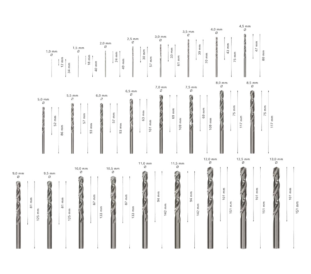 Uključeni promjeri (mm): 1, 1,5, 2, 2,5, 3, 3,5, 4, 4,5, 5, 5,5, 6, 6,5, 7, 7,5, 8, 8,5, 9, 9,5, 10, 10,5, 11, 11,5, 12, 12,5, 13