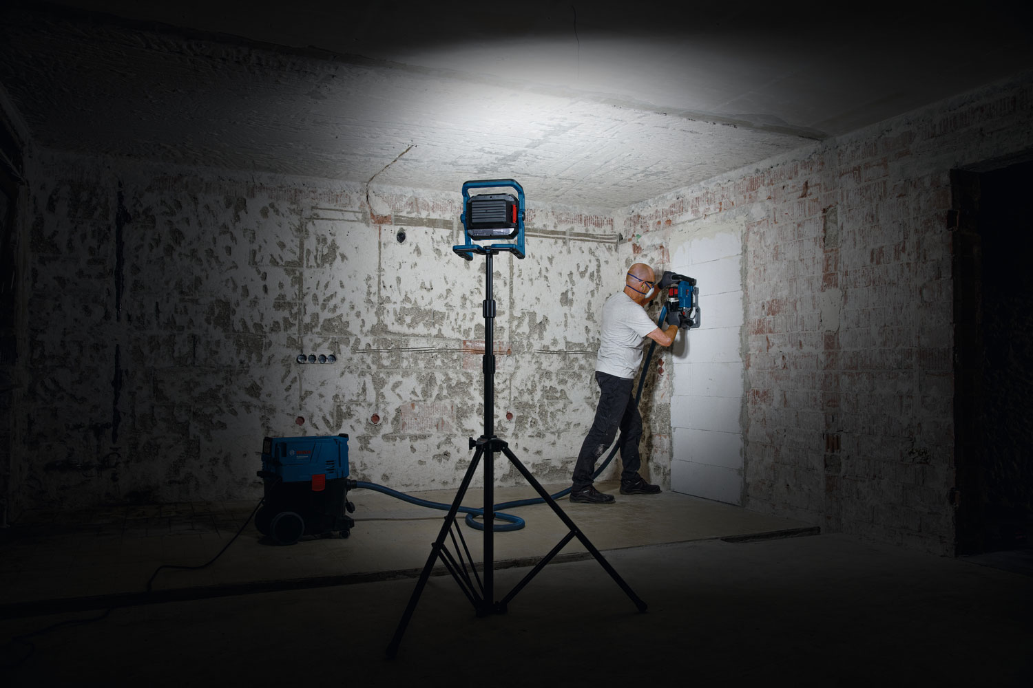Stativ za svjetlo Bosch GLT 300-40 Professional namijenjen je profesionalnoj uporabi na gradilištima te omogućuje stabilno i sigurno postavljanje svjetiljki s navojnom rupom 5/8″. Omogućuje podizanje rasvjete do visine od 3 metra, čime se smanjuje rizik od zasljepljivanja i stvaranja sjena te osigurava ravnomjernije osvjetljenje radnog prostora. Zahvaljujući jednostavnom mehanizmu, postavljanje traje manje od 15 sekundi. Izrađen je od aluminija, lagan je i kompaktno se sklapa za lakši transport i skladištenje. Gumirane noge štite osjetljive površine od ogrebotina i osiguravaju dodatnu stabilnost. Kompatibilan je s Bosch 18V svjetiljkama za gradilišta koje imaju navoj 5/8″, poput modela GLI 18V-1900, GLI 18V-2200 C, GLI 18V-4000 C i GLI 18V-10000 C.