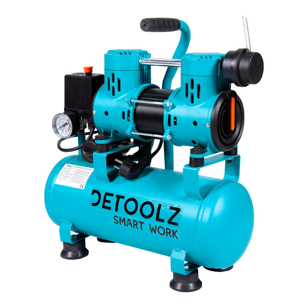 Zračni kompresor bez ulja, 880W, 9L, Detoolz DZ-C265 je robustan, učinkovit, siguran i jednostavan za korištenje proizvod za proizvodnju komprimiranog zraka potrebnog za rad širokog spektra pneumatskih alata. Osim toga, ovaj kompresor radi bez ulja i na taj način omogućuje dovod čistog zraka bez zagađivača koji se može široko koristiti u stomatologiji, akvakulturi, kemijskoj industriji, prehrambenoj industriji, farmaceutskoj industriji, laboratorijskoj opremi i mnogim drugim sličnim primjenama. Kompresor DZ-C265 može se koristiti i kao vakuumska pumpa. Bezuljni zračni kompresor, 880W, 9L, Detoolz DZ-C265 je proizvod za individualnu ili kućnu upotrebu i ne dopušta industrijsku uporabu. Kompresor se smije koristiti samo u skladu s njegovom namjenom. Svaka uporaba izvan ovog područja smatra se neusklađenom. Za bilo kakvu materijalnu štetu ili nesreću bilo koje vrste koja je posljedica nepravilne uporabe kompresora, prodavatelj/distributer ili proizvođač oslobađaju se odgovornosti. Ovaj proizvod je dizajniran i zajamčen za rad na temperaturama okoline između +5°C i 35°C na nadmorskoj visini do 1000 m. Optimalna radna temperatura je 5 … 20 ° C. Vlažnost zraka treba biti manja od 50% na 35°C. Mogu se skladištiti ili transportirati na temperaturi okoline između -25°C i 40°C. Tihi rad ispod 70dB. Konstrukcija koja omogućuje odvođenje topline. Robusna konstrukcija, izrađena od najkvalitetnijih proizvodnih materijala, otporna na produženi vijek trajanja. Kompresor DZ-C265 ima kotače koji znatno olakšavaju pozicioniranje i transport.