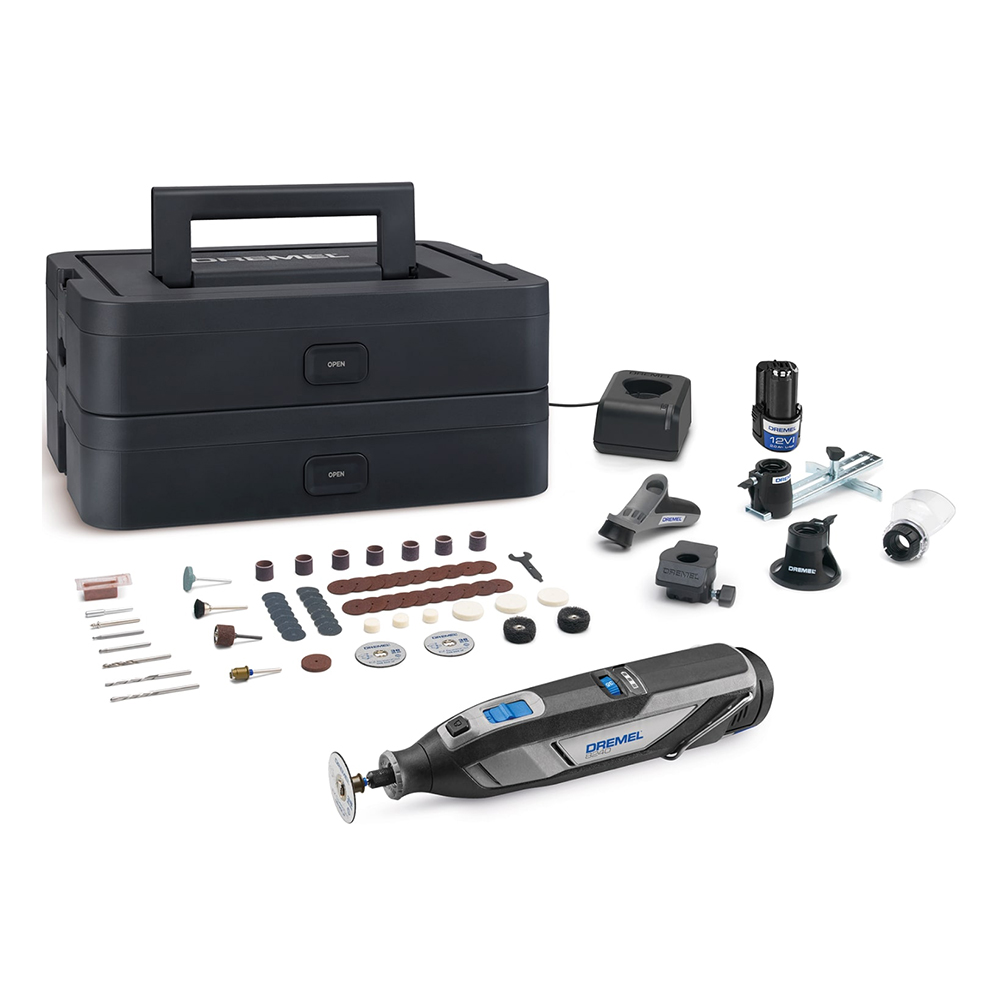Dremel 8240 5/65 Platinum je snažan i praktičan višenamjenski alat na baterijski pogon, idealan za razne DIY projekte. S naponom od 12 V i motorom koji postiže brzinu od 5.000 do 35.000 okretaja u minuti, alat omogućuje precizan i učinkovit rad. Mekani rukohvat osigurava udobnost, dok LED indikator prikazuje stanje baterije. Motorna kočnica omogućuje brz prekid vrtnje nakon gašenja uređaja, a EZ prsten prihvata eliminira potrebu za ključem prilikom mijenjanja nastavaka. Komplet dolazi s bogatim setom dodataka i novim održivim kovčegom za alat, čineći ga savršenim izborom za raznovrsne zadatke.