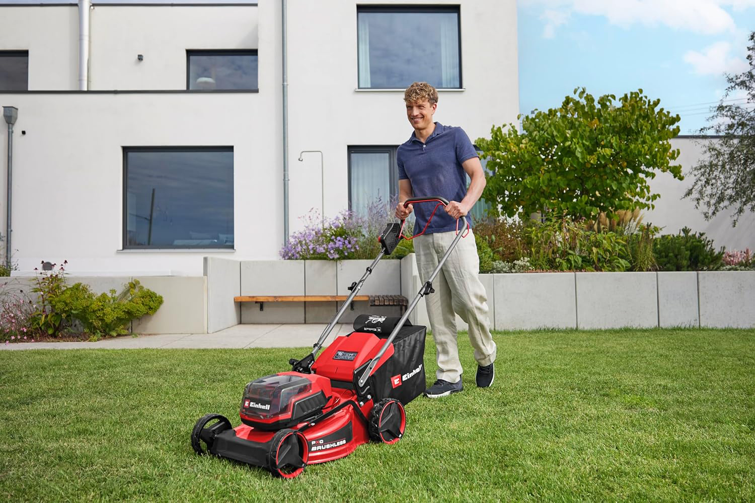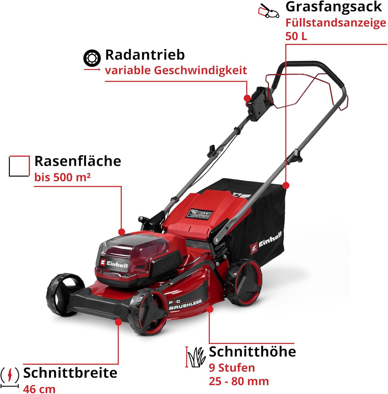 Einhell GC-CM 36/46 S Li BL (2×4,0Ah) akumulatorska kosilica snažan je i izdržljiv izbor za uredne kućne travnjake do 500 m2. Zahvaljujući 36 V Twin-Pack sustavu s dvije 18 V Power X-Change baterije pruža snažne performanse i dulje vrijeme rada, dok brushless motor osigurava više snage, manju potrebu za održavanjem i dulji vijek trajanja. Samohodni pogon s promjenjivom regulacijom brzine olakšava košnju na gušćoj travi, neravnom terenu i blagim nagibima. Širina košnje od 46 cm omogućuje brz rad, a centralno podešavanje visine košnje u 9 razina od 25 do 80 mm olakšava prilagodbu različitim uvjetima travnjaka. Velika košara od 50 litara s pokazivačem napunjenosti smanjuje potrebu za čestim pražnjenjem. Robusno čelično kućište osigurava dugotrajnost, dok sklopiva i visinski podesiva ručka doprinosi udobnosti rada i jednostavnijem spremanju. U pakiranju dolaze 2 x 4,0 Ah baterije i Twincharger punjač za istovremeno punjenje obje baterije.