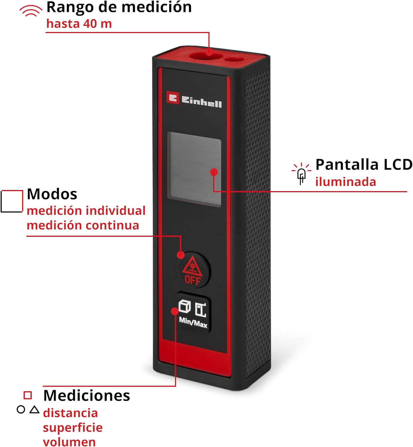 Einhell laserski mjerni alat TC-LD 40 R precizan je i kompaktan uređaj za brzo mjerenje udaljenosti, površina i volumena u kućanstvu, vrtu ili na gradilištu. Omogućuje mjerenje do 40 metara uz dobru točnost, a zahvaljujući mogućnosti odabira mjernog referentnog mjesta s prednje ili stražnje strane uređaja prilagođava se različitim situacijama mjerenja. Kontinuirani način mjerenja s prikazom minimalnih i maksimalnih vrijednosti olakšava rad pri označavanju ili provjeri udaljenosti. Osvijetljeni LCD zaslon osigurava jasnu čitljivost rezultata, dok kućište s mekim rukohvatom omogućuje sigurno i udobno držanje. Laser se aktivira zasebno radi dodatne sigurnosti, a automatsko isključivanje nakon jedne minute neaktivnosti štedi bateriju. Zahvaljujući malim dimenzijama i praktičnoj torbici, ovaj laserski mjerač jednostavan je za nošenje i idealan za svakodnevnu upotrebu.