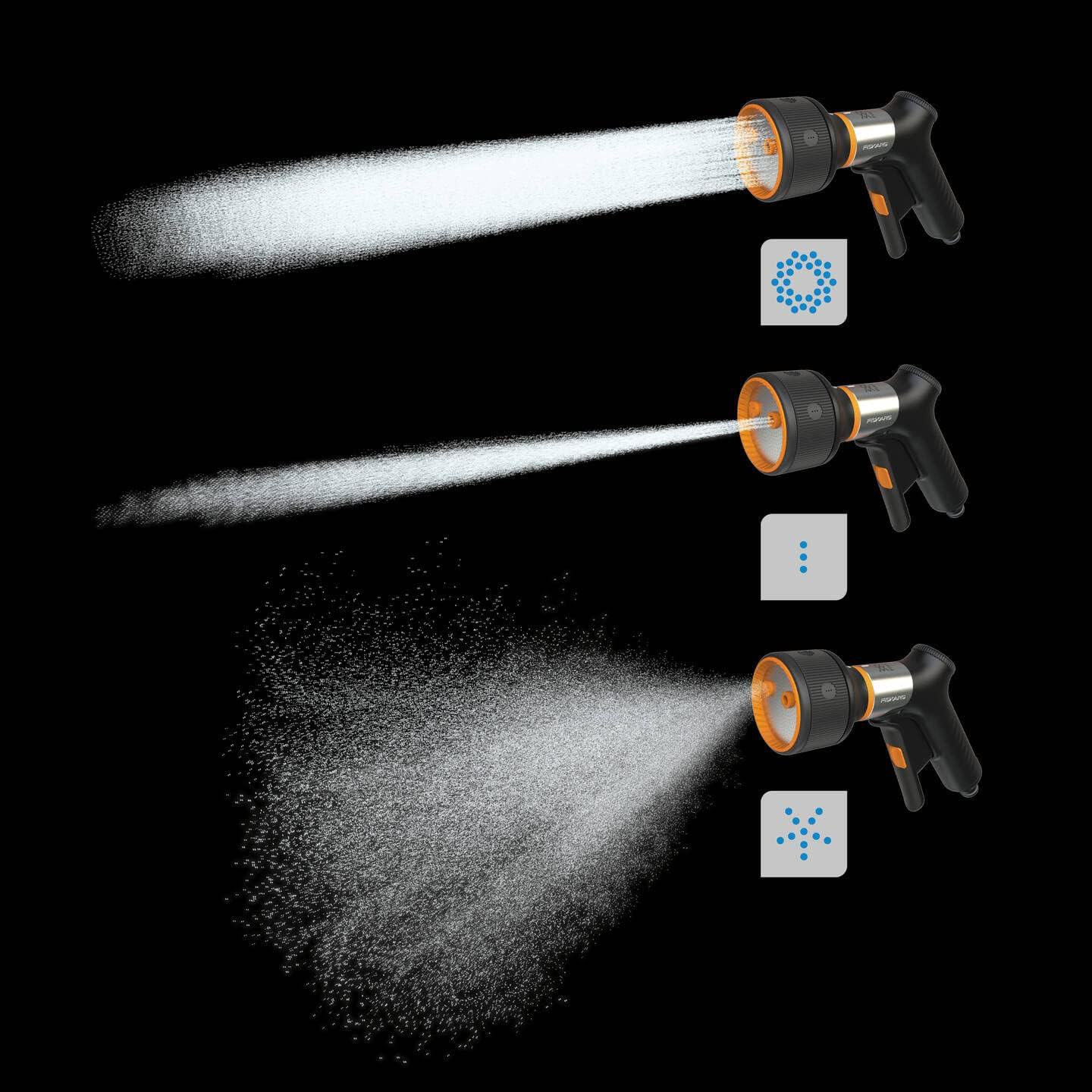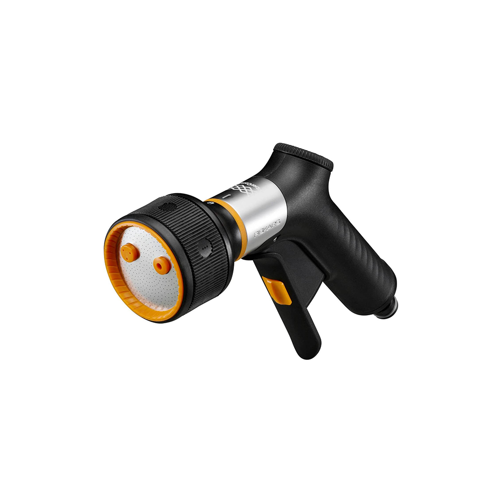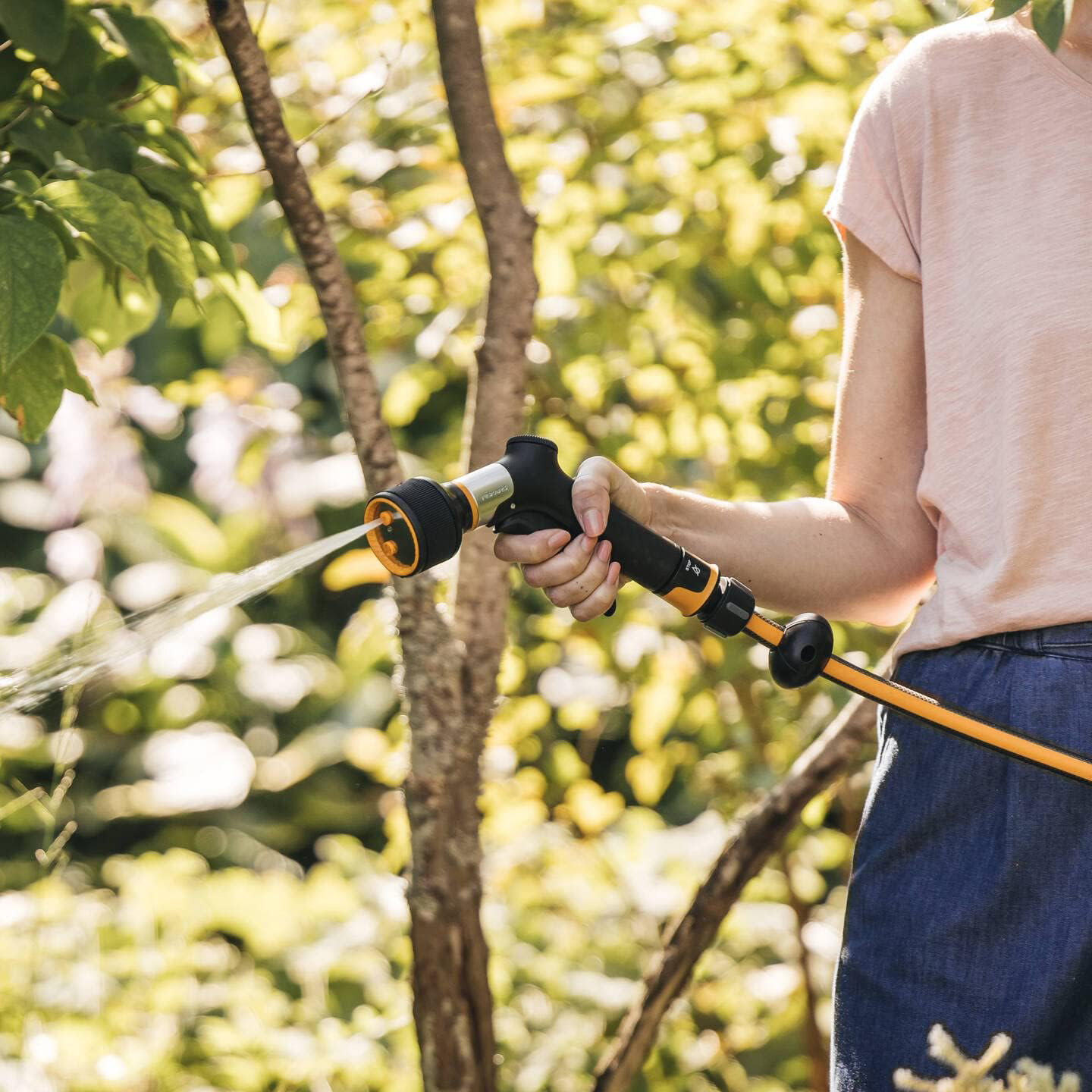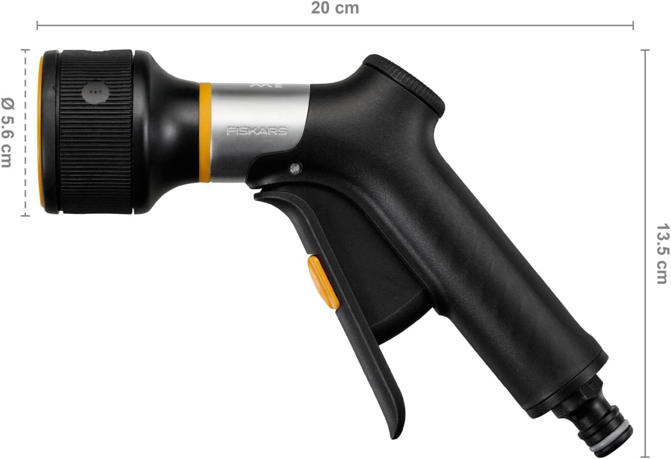 Pištolj za zalijevanje Fiskars FiberComp 1067194 namijenjen je svestranoj upotrebi u vrtu, oko kuće i dvorišta. Omogućuje tri različita načina prskanja – snažni mlaz, maglu i tuš – što ga čini idealnim za ispiranje prljavštine, opće zalijevanje te nježnu njegu osjetljivih biljaka i presadnica. Kontinuirano podesiv protok vode i praktična on/off blokada omogućuju ugodan rad bez zamaranja ruke. Kućište izrađeno od izdržljivog FiberComp materijala s metalnim ojačanjima osigurava dug vijek trajanja, otpornost na vremenske uvjete i mraz, dok uklonjivi filter za vodu štiti mlaznicu od nečistoća. Univerzalni priključak kompatibilan je s većinom vrtnih crijeva i drugih marki.