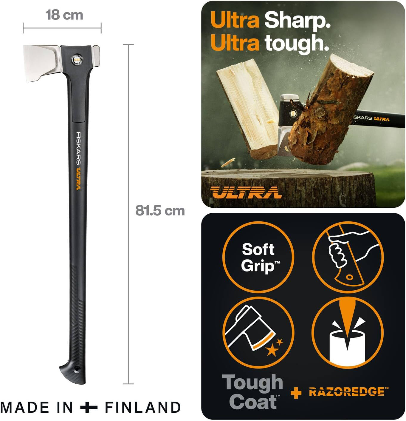 Sjekira za cijepanje Fiskars X-Series Ultra U32 (1082131) namijenjena je cijepanju vrlo velikih trupaca te pruža iznimnu snagu i učinkovitost pri radu. Glava sjekire ima široki klinasti oblik koji omogućuje lakše prodiranje u drvo i učinkovitije cijepanje, dok istovremeno olakšava vađenje oštrice iz drva. Oštrica od kvalitetnog ugljičnog čelika dodatno je unaprijeđena modernim premazom koji smanjuje trenje, povećava otpornost na habanje i smanjuje mogućnost zaglavljivanja u drvu. Drška izrađena od FiberComp materijala ojačanog staklenim vlaknima izuzetno je čvrsta i lagana te učinkovito apsorbira vibracije tijekom rada. Produžena SoftGrip™ zona rukohvata pruža sigurniji hvat i bolju kontrolu, čak i pri snažnim zamahima. Glava sjekire trajno je spojena s drškom kako bi se osigurala maksimalna sigurnost i dugotrajnost. Sjekira dolazi s praktičnom plastičnom futrolom koja štiti oštricu i omogućuje sigurno nošenje ili vješanje alata.