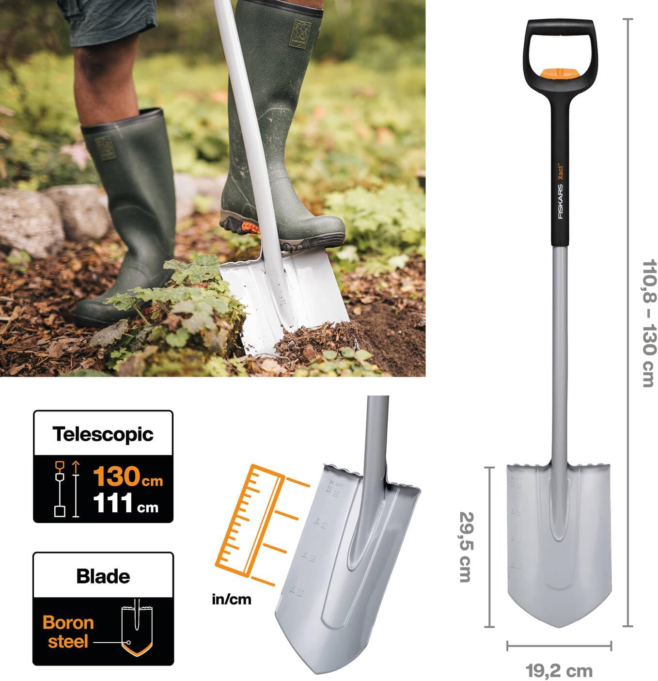 Vrtlarstvo je zahtjevna zabava, a alati Fiskars Xact™ uključuju svrhovitu inovaciju i precizno prilagođavanje za vrhunsku izvedbu, omogućujući vam da radite više onoga što volite. Xact™ teleskopska šiljasta lopatica ima prilagodljivu duljinu za savršeno pristajanje. Njegova glava od bor čelika čvrsto je zavarena na pametnu kompozitnu i čeličnu teleskopsku osovinu koja se proteže od 110,8 cm do 130 cm. Izuzetno jaka, zašiljena lopatica s neklizajućom bočnom daskom je naoštrena na rubu i sa strane, što je čini idealnom za probijanje tvrdog tla. Njegova SoftGrip™ push-pull D-ručka pruža sigurnu kontrolu kopanja. Fiskars teleskopski Xact™ alati rade s vašim tijelom, kombinirajući savršenu duljinu s laganim, ali vrlo izdržljivim materijalima. Xact™ teleskopska šiljasta lopatica sadrži inovacije koje vam omogućuju da radite više od onoga što volite. Idealan za kopanje rupa, obrubljivanje gredica i uklanjanje malih količina zemlje. Neklizajuća daska za stepenice. Naoštrena oštrica i strane glave lako režu tvrdo ili kamenito tlo i korijenje. Čelična glava od bora zavarena je na osovinu od kompozita i čelika za vrhunsku izdržljivost. Mjerna skala na oštrici za precizno kopanje. Teleskopska osovina rasteže se od 110,8 cm do 130 cm, tako da je možete udobno koristiti s različitih visina. Push-pull ručka s SoftGrip™ osigurava ugodnu kontrolu kopanja. Lagana, jaka lopata optimizirana je za ergonomiju. Duljina: 110,8 – 130 cm. Kvaliteta od 1649. godine.