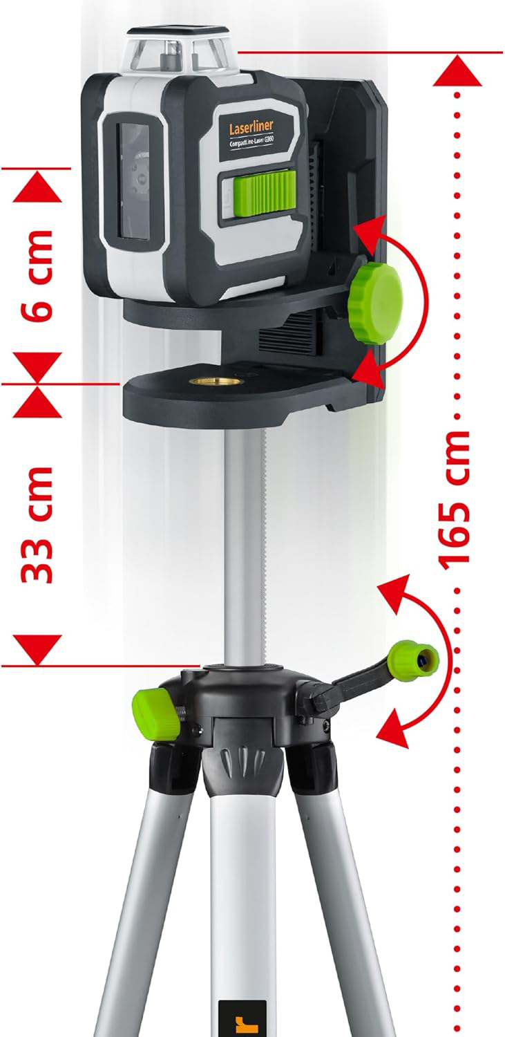 Laserliner CompactLine-Laser G360 je križnolinijski laser koji projicira vodoravnu liniju od 360° i okomitu liniju za precizno niveliranje i poravnavanje objekata u cijeloj prostoriji. Zahvaljujući tehnologiji zelenog lasera, linije su jasno vidljive i u zahtjevnim uvjetima osvjetljenja. Uređaj ima funkciju automatskog poravnanja koja štedi vrijeme, mogućnost ručnog podešavanja nagiba, te zaštitu od pogrešaka putem funkcije nagiba. Pojedinačne laserske linije mogu se uključivati i isključivati prema potrebi, a integrirani način rada prijemnika omogućuje korištenje i na otvorenom za veće udaljenosti. Kroz aplikaciju Commander moguće je daljinsko upravljanje putem pametnog telefona. Kompaktan dizajn, zatvarač klatna za siguran transport te jednostavno rukovanje čine ga idealnim alatom za profesionalce i zahtjevne korisnike.