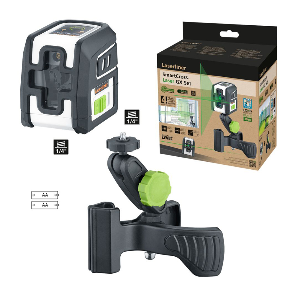 SmartCross-Laser GX je kompaktan zeleni križni laser koji projicira jasno vidljiv laserski križ za precizno horizontalno i vertikalno poravnavanje objekata. Opremljen je funkcijom ručnog nagiba za jednostavno postavljanje kosina, kao i 1/4” navojem za montažu na stativ ili isporučeni svestrani držač FlexClamp, koji omogućuje brzo i sigurno pričvršćivanje bez oštećivanja površina. Zahvaljujući integriranom načinu rada s prijemnikom, uređaj se može koristiti i na otvorenom ili na većim udaljenostima. Automatsko samoniveliranje štedi vrijeme, a vizualni signali upozoravaju kada uređaj nije u nivou. Kućište je izrađeno od velikog udjela reciklirane plastike, čime se doprinosi održivosti i zaštiti okoliša.