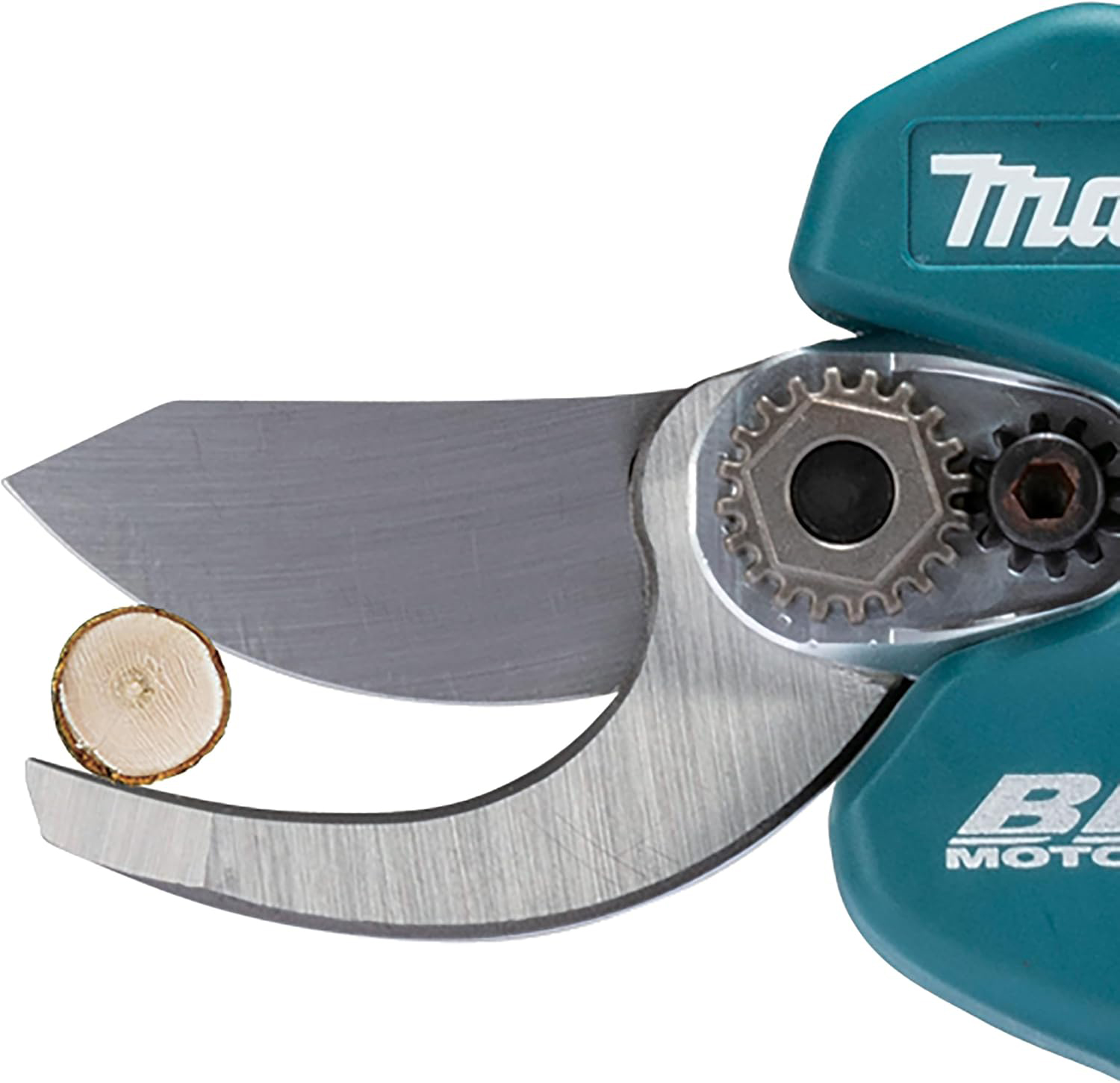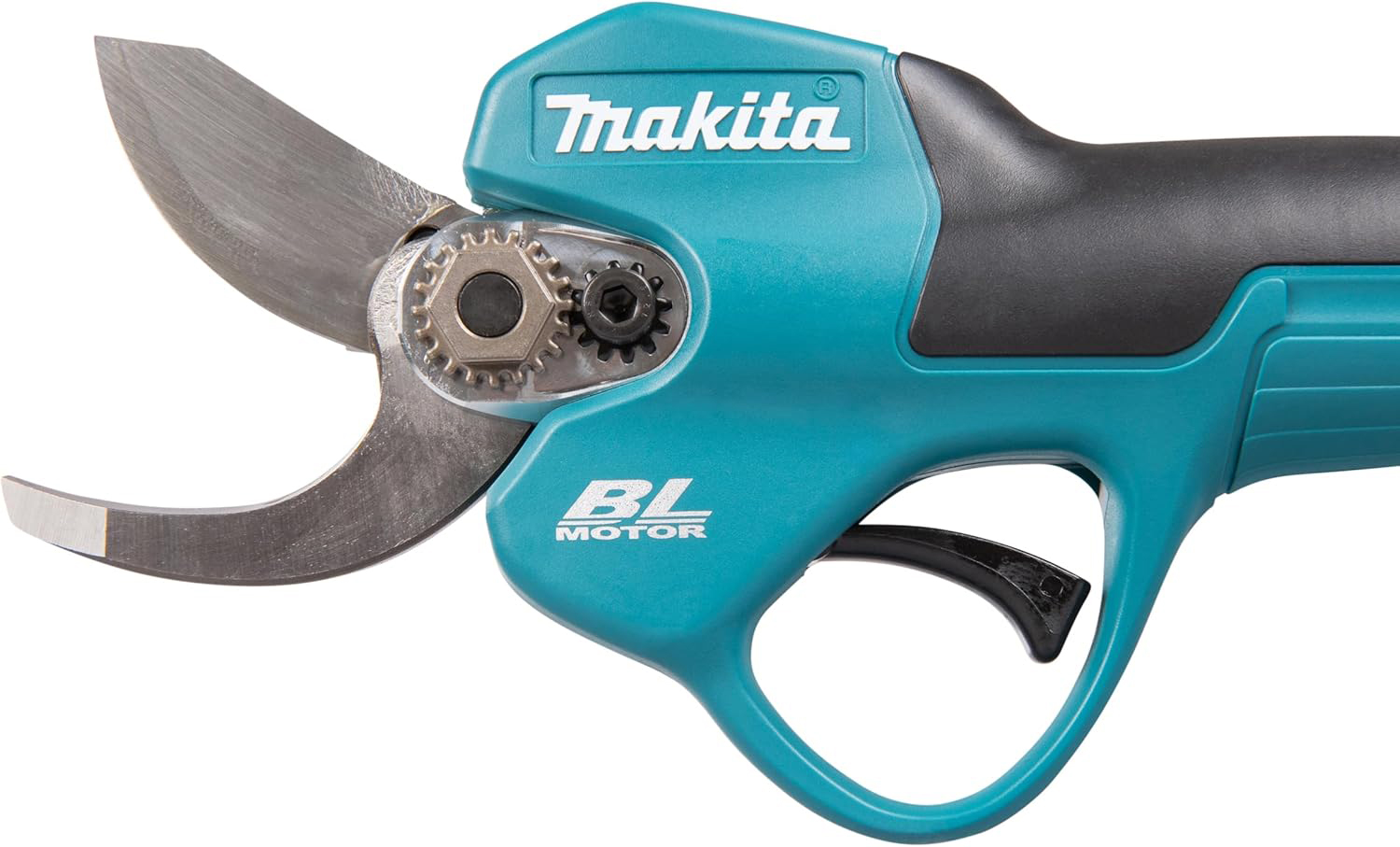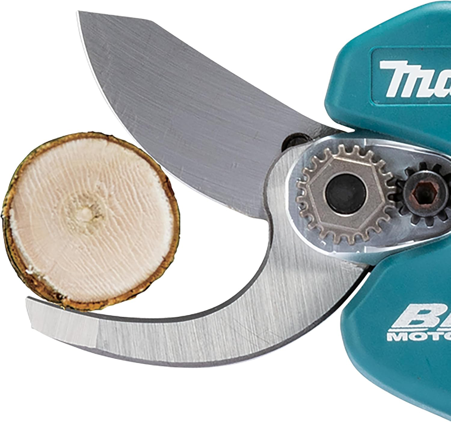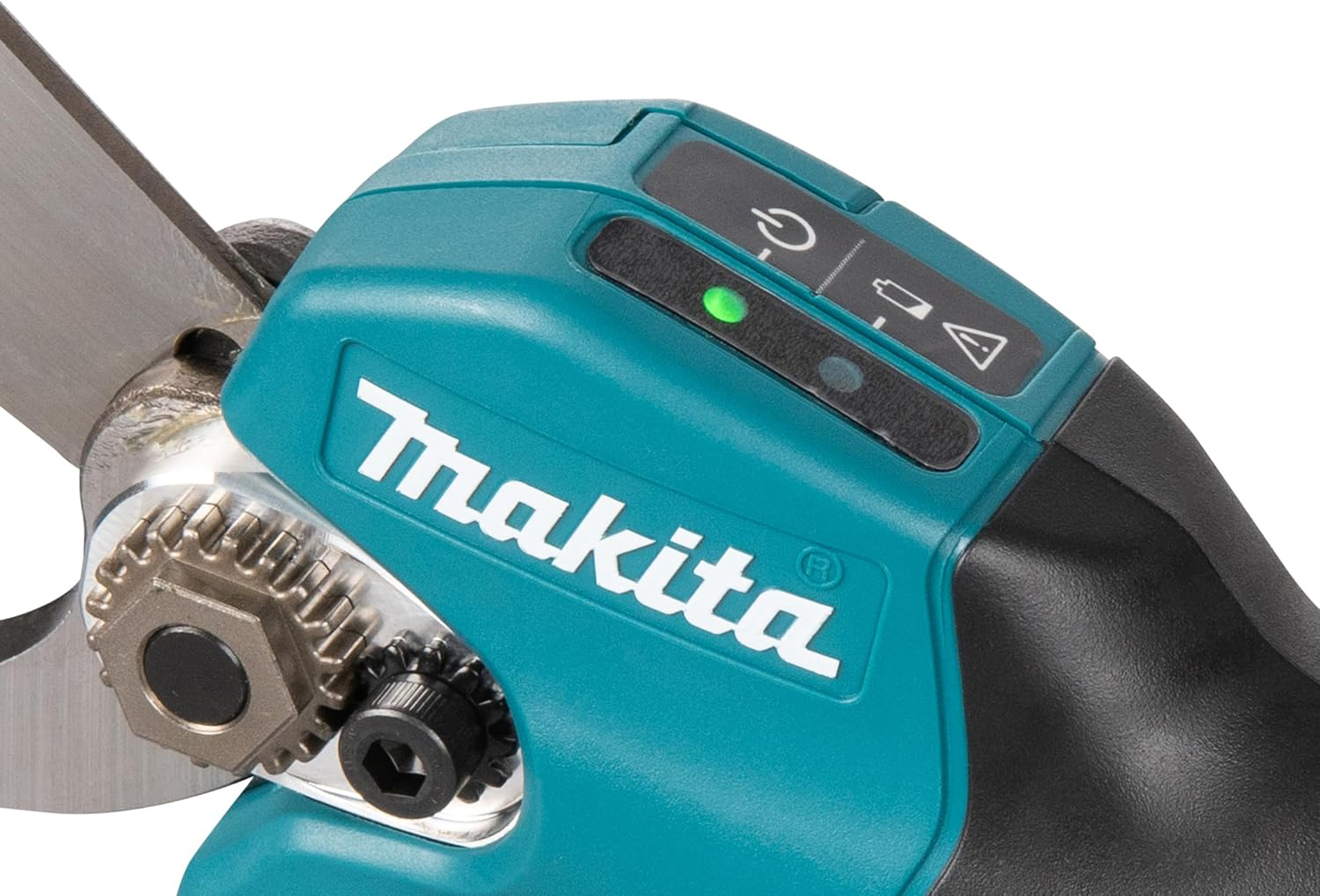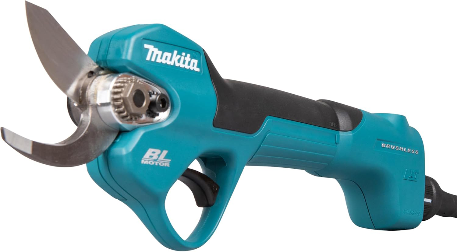 Makita DUP180T001 akumulatorske škare za rezanje grana i loze namijenjene su profesionalnim i zahtjevnim korisnicima poput vrtlara, voćara, arborista, cvjećara te ljubitelja bonsaija. Zahvaljujući snažnom 18 V LXT sustavu i preciznoj oštrici omogućuju glatko i čisto rezanje usporedivo s klasičnim ručnim škarama, ali uz znatno manji fizički napor. Elektroničko podešavanje otvora oštrice u četiri stupnja omogućuje prilagodbu različitim promjerima grana do 30 mm, čime se optimizira brzina i učinkovitost rada. Baterija je spojena na alat putem adaptera s kabelom koji se može pričvrstiti za remen, što značajno smanjuje težinu alata u ruci i omogućuje dugotrajniji rad bez umora. Ulje za podmazivanje može se dodati bez rastavljanja oštrica, što olakšava održavanje i produžuje vijek trajanja alata.