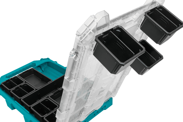 Prozirni poklopac s rebrastim ojačanjima omogućuje trenutačan pregled sadržaja i sprječava pomicanje pretinaca. 11 uklonjivih pretinaca u tri veličine, uz dodatne pregrade, omogućuju potpuno prilagođavanje prostoru za skladištenje. Pretinci se mogu vješati na poklopac ili zid, čineći ovaj organizator iznimno svestranim.