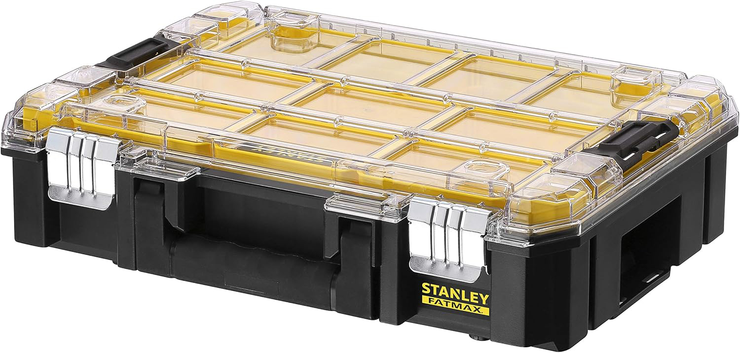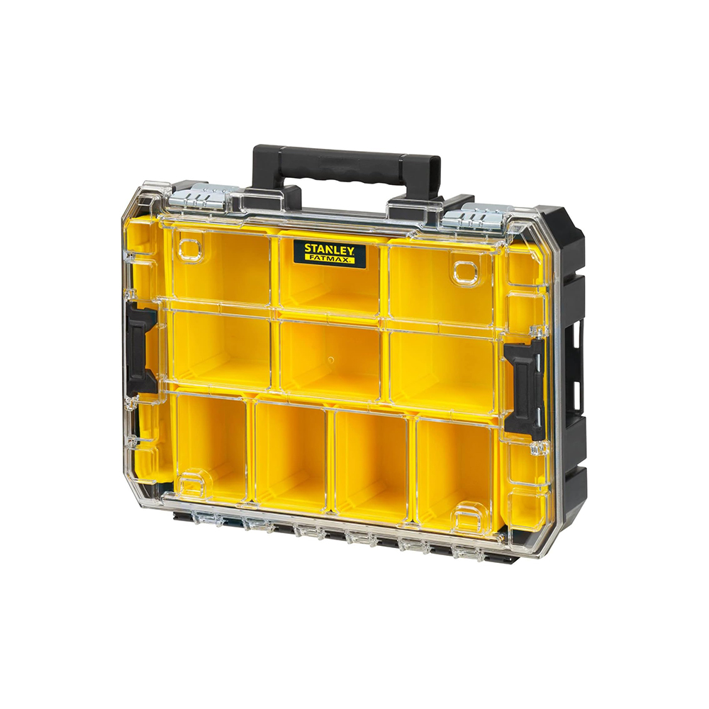 STANLEY FatMax PRO-STACK organizator savršeno je rješenje za sigurno i pregledno spremanje sitnih dijelova, vijaka, matica i pribora. Opremljen je s 10 uklonjivih čašica koje omogućuju jednostavnu organizaciju sadržaja, dok prozirni poklopac od polikarbonata osigurava jasnu vidljivost bez potrebe za otvaranjem. Zahvaljujući metalnim zasunima otpornima na hrđu i udobnoj ručki za nošenje, ovaj organizator nudi dugotrajnost i praktičnost u radu. Dio je STANLEY FATMAX PRO-STACK sustava, modularnog i međusobno povezivog sustava spremnika koji omogućuje prilagodljivo i lako prenošenje alata i pribora prema vašim potrebama.
