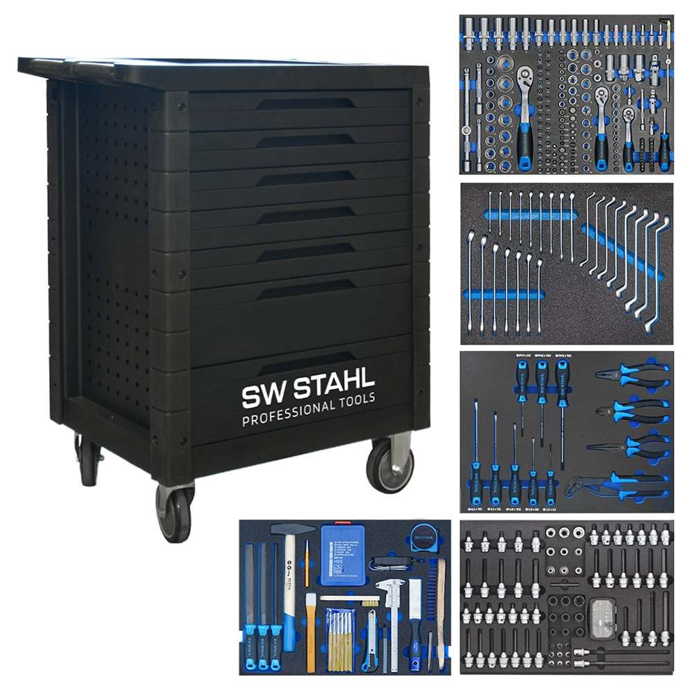 Radionička kolica TT401 profesionalno su rješenje za organizaciju alata u radionici, servisu ili garaži, namijenjena korisnicima koji traže preglednost, trajnost i učinkovit rad. Kolica imaju sedam ladica s potpunim izvlačenjem, od kojih je pet opremljeno visokokvalitetnim alatima smještenim u precizno oblikovane pjenaste uloške. Ukupno 347 komada alata pokriva širok raspon radioničkih i servisnih zadataka, uključujući nasadne ključeve, kombinirane i viljuškasto-okaste ključeve, kliješta, odvijače, bitove i opći radionički alat. Čvrsta konstrukcija, optimalne dimenzije i potpuno iskorišten prostor ladica omogućuju siguran transport, brzo pronalaženje alata i profesionalan radni tijek.