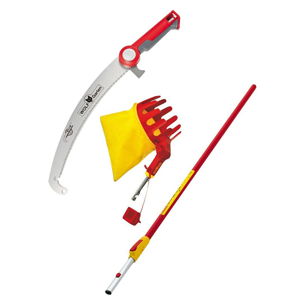 Set Wolf-Garten Multi-star Powercut Saw Pro 370 s teleskopskom drškom ZM-V4 i beračem voća RG-M namijenjen je profesionalnom održavanju voćnjaka i okućnica, omogućujući sigurno rezanje grana i berbu plodova na velikim visinama bez korištenja ljestvi. Zakrivljeni list pile osigurava snažno i precizno rezanje debljih grana, dok posebni potezni zubi omogućuju čisti rez i smanjuju rizik od bakterijskih oštećenja drveta. Ergonomska drška s mekanom oblogom i MaxControl završecima pruža siguran i udoban hvat. Multi-star® click sustav omogućuje brzo i pouzdano spajanje alata, a dodatna kuka za grane i zaštita kore olakšavaju rad i štite biljke. U kombinaciji s teleskopskom drškom ZM-V4 postiže se doseg do 5,5 m, dok RG-M berač voća omogućuje jednostavnu i sigurnu berbu.